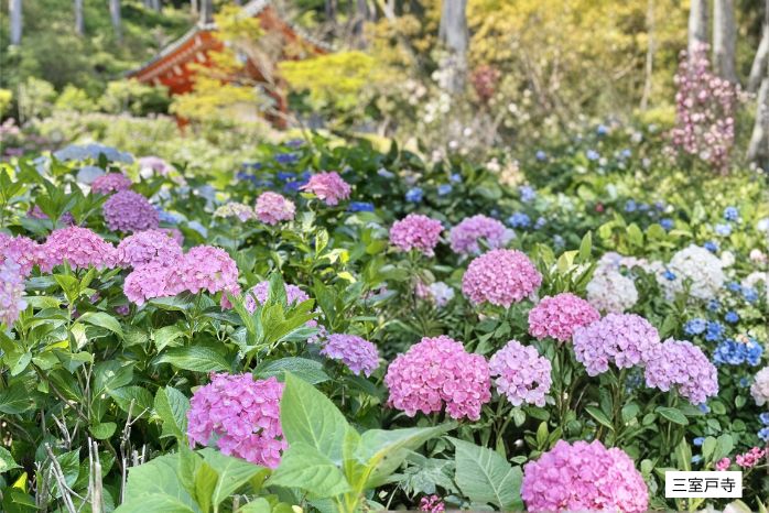 境内には江戸時代に再建された本堂や平安時代作の阿弥陀三尊座像を安置する阿弥陀堂、三重の塔などの歴史的建造物が立ち並んでいます。初夏の6月頃には2万株のアジサイが見られ、『あじさい寺』としても知られています。